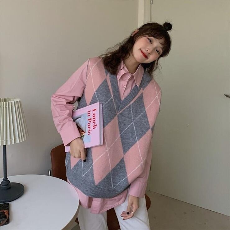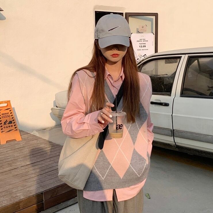 アーガイル柄 ニット ベスト Vネック ノースリーブ 袖なし チョッキ 重ね着 レイヤード プルオーバー ゆったり オーバーサイズ カジュアル メンズライク レディース トップス グレー ホワイト B-0456 【お取寄せ】
