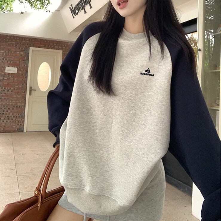 スウェット トレーナー 裏起毛 ラグランスリーブ 長袖 クルーネック ラウンドネック ロゴ プルオーバー ゆったり ルーズ オーバーサイズ ビッグサイズ 大きいサイズ カジュアル メンズライク ストリート レディース トップス 紺 ネイビー B-0464 【お取寄せ】