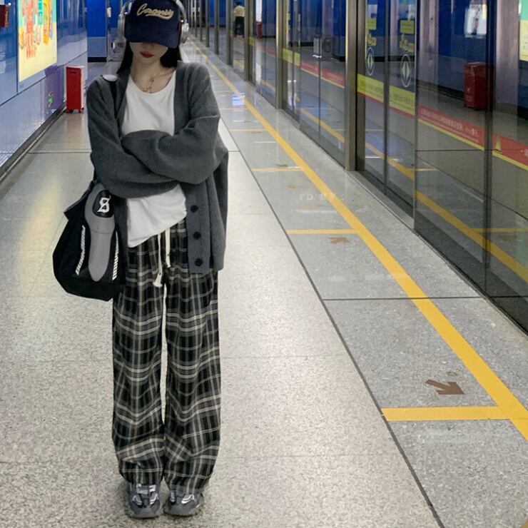 チェック柄が目を引くワイドパンツ。