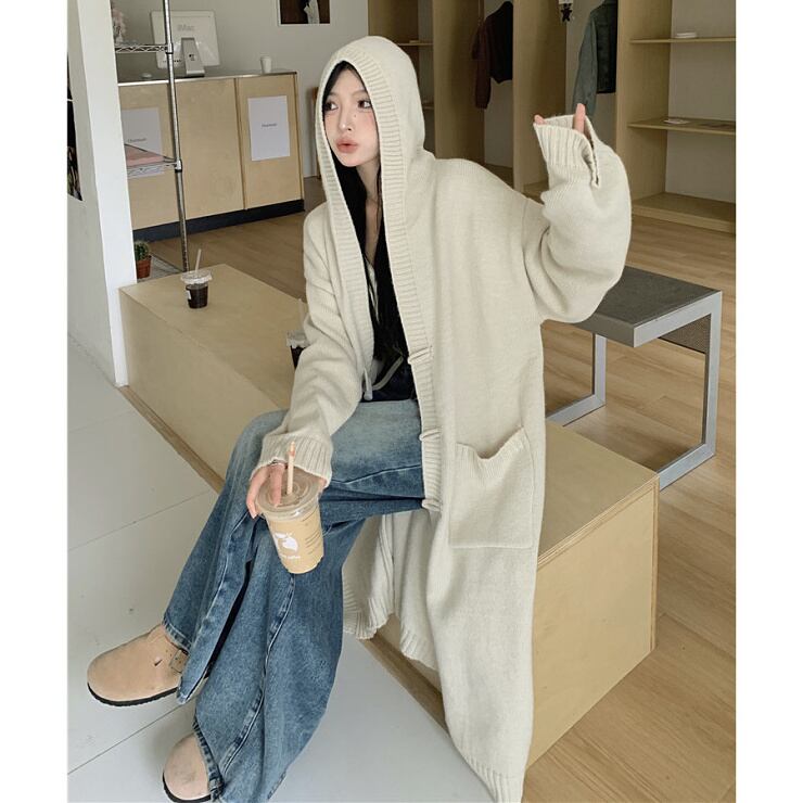 ゆったりとしたシルエットのフード付きロングニットカーディガン。