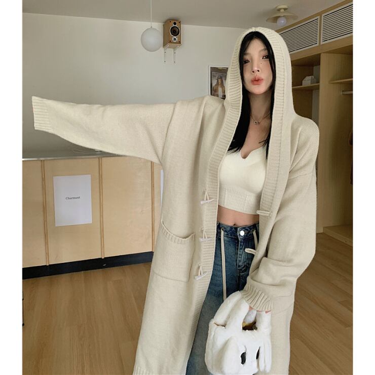 フード付き ロング ニット カーディガン 長袖 ドロップショルダー トグルボタン 膝丈 ミディアム丈 ニットパーカー コーディガン 羽織 カジュアル ルーズ オーバーサイズ ゆったり 体型カバー レディース アウター B-0473 【お取寄せ】