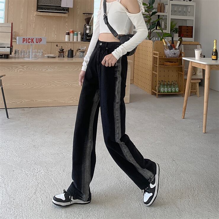 デニムパンツ ストレート サイドライン ハイウエスト ジーンズ ジーパン セミワイド カジュアル ストリート メンズライク レディース ボトムス 黒 B-0488 【お取寄せ】