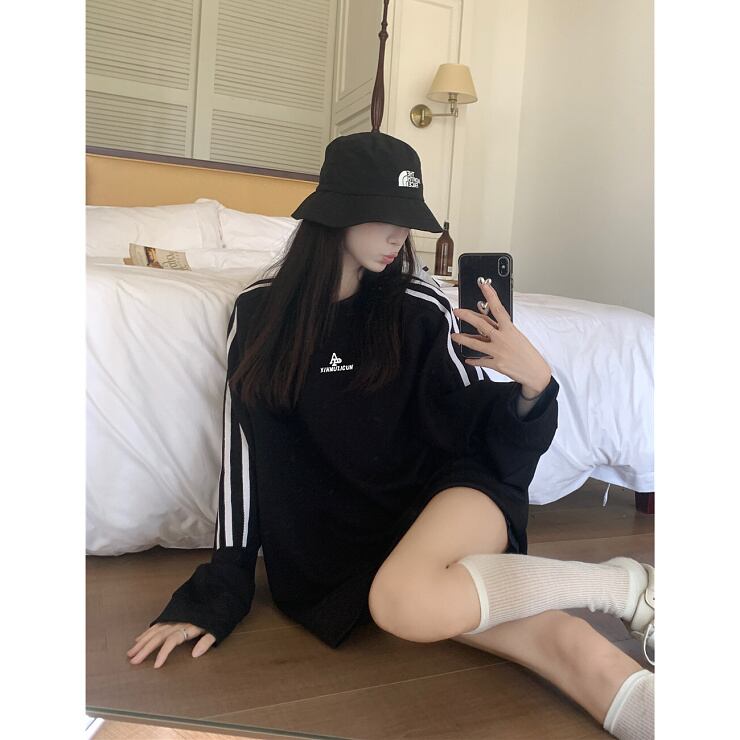 裏起毛 スウェット トレーナー ライン 長袖 クルーネック ラウンドネック ロゴ プルオーバー ゆったり ルーズ オーバーサイズ ビッグサイズ 大きいサイズ カジュアル メンズライク ストリート スポーツミックス ユニセックス メンズ レディース トップス 黒 白 B-0490 【お取寄せ】