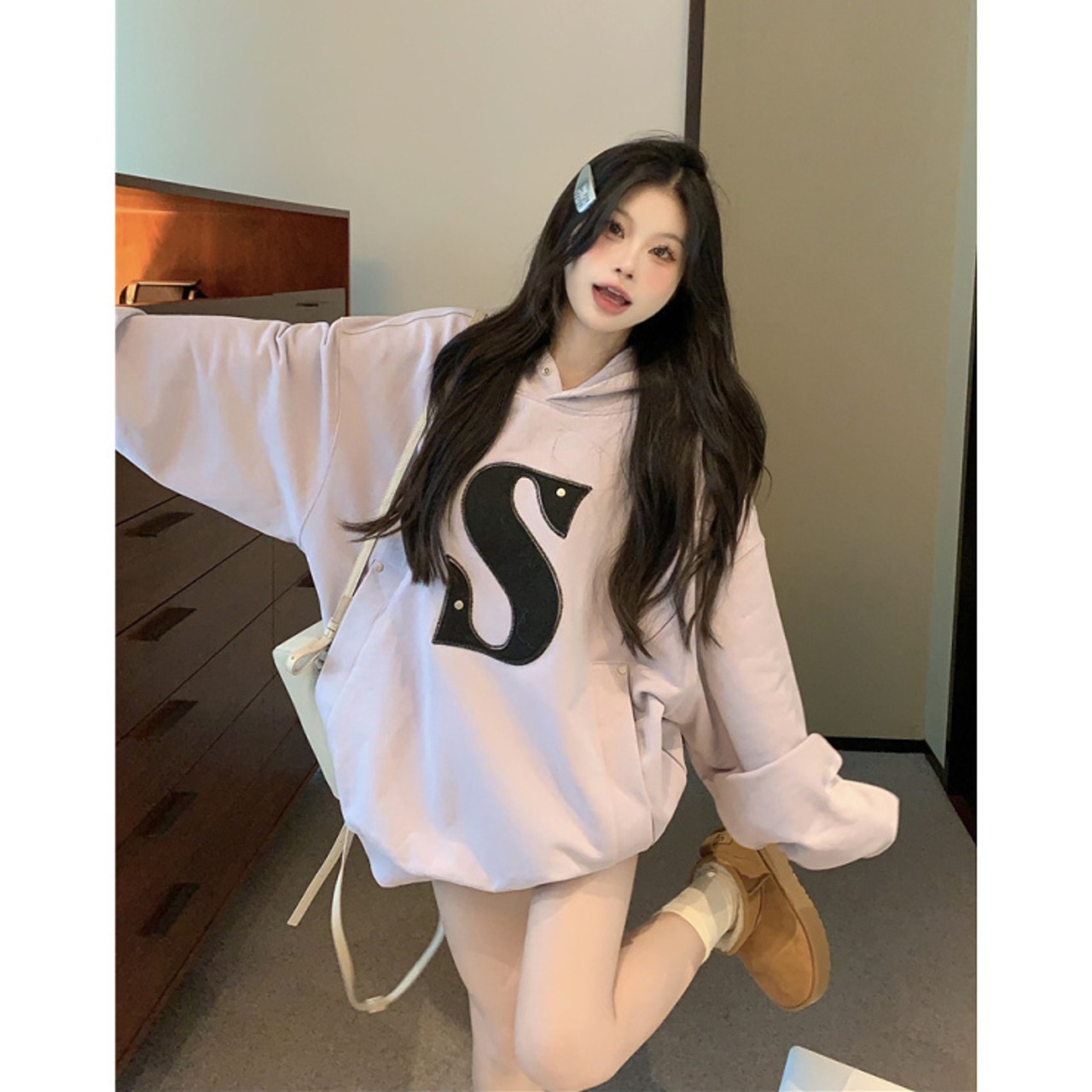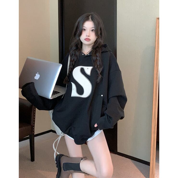 パーカー フーディー プルオーバー ロゴ 長袖 ドロップショルダー フード付き スウェット ゆったり オーバーサイズ カジュアル メンズライク ストリート レディース トップス 黒 紫 B-0504 【お取寄せ】