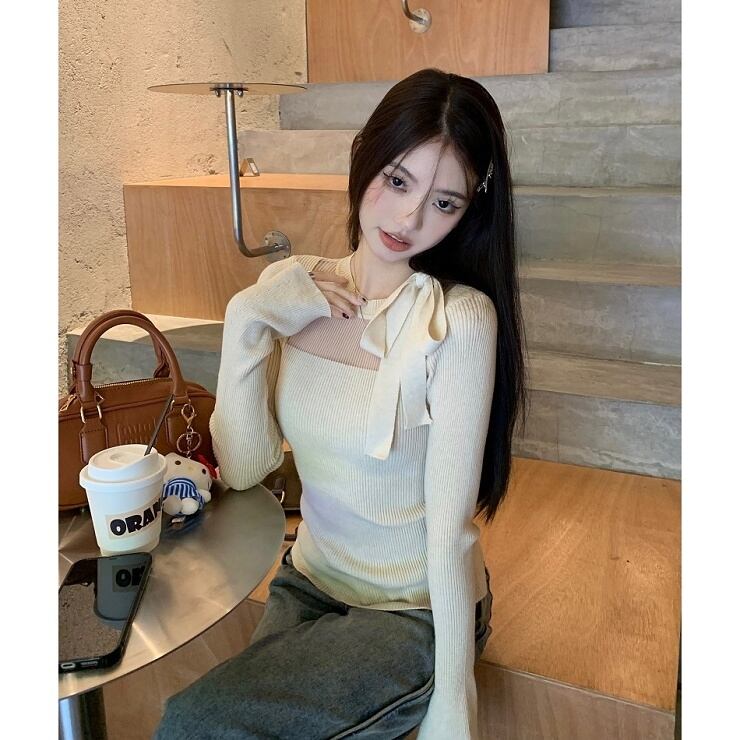 リブニット トップス 長袖 リボン シースルー 透け感 ニットソー プルオーバー 無地 タイト スリムフィット ガーリー きれいめ レディース ベージュ B-0515 【お取寄せ】