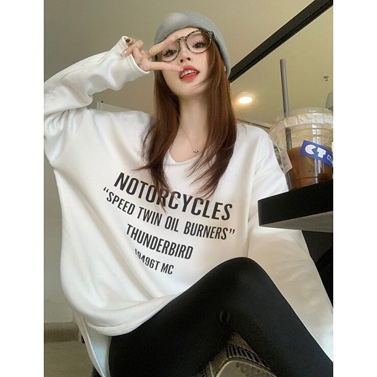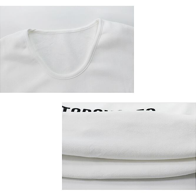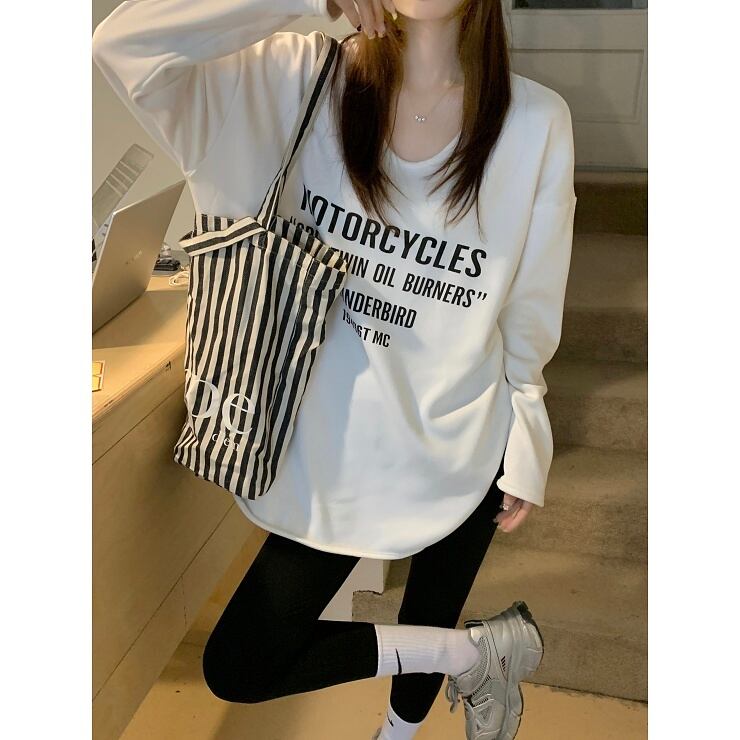 Tシャツ 長袖 ロゴ Vネック ラウンドヘム ロンT プルオーバー カジュアル オーバーサイズ ゆったり レディース トップス 白 B-0530 【お取寄せ】