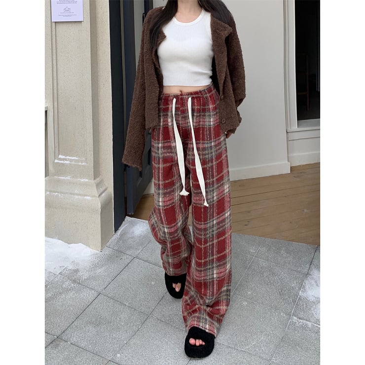 裏起毛で暖かく、ゆったりとしたシルエットが魅力のチェック柄ワイドパンツ。