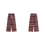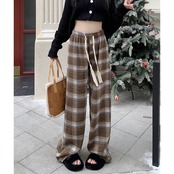 チェック柄 パンツ ワイドパンツ ウエストゴム ハイウエスト イージーパンツ ストレートパンツ ロングパンツ ゆったり カジュアル きれいめ レディース ボトムス 黒 茶 赤 青 水色 B-0535 【お取寄せ】