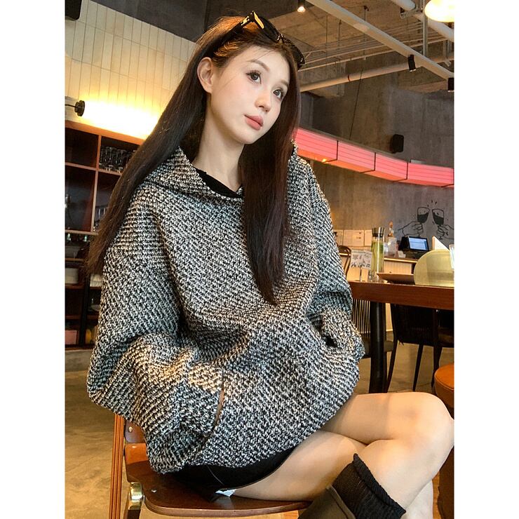おしゃれなツイード生地が上品な雰囲気のパーカー。