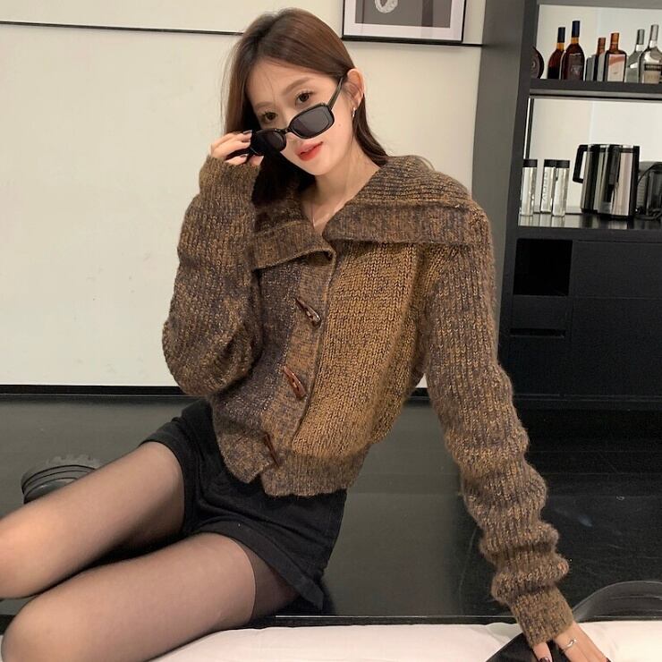 メランジニット カーディガン 長袖 ショート丈 トグルボタン スタンドカラー ハイネック タートルネック 羽織 カジュアル レディース トップス アウター 茶 B-0551 【お取寄せ】