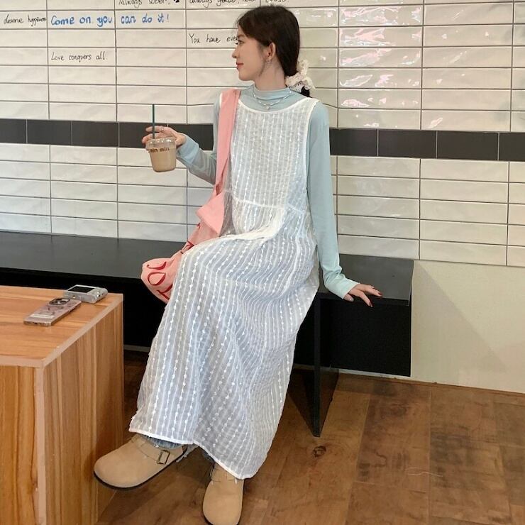バックオープン ワンピース ロング ブラウス ノースリーブ リボン レース シースルー 透け感 Aライン ベスト ジレ レイヤード レディース 白 B-0585 【お取寄せ】