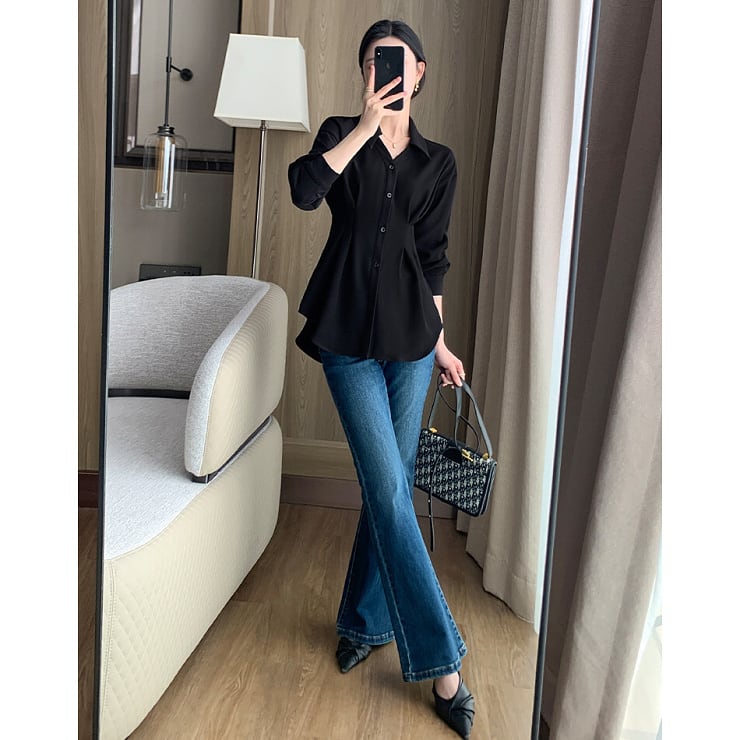 シャツ ブラウス 長袖 ロング丈 スキッパーカラー タック ウエストシェイプ モノトーン 上品 シック レディース トップス 黒 B-0624 【お取寄せ】