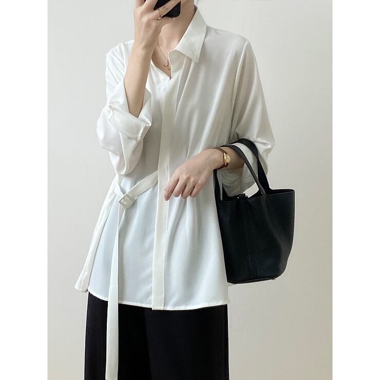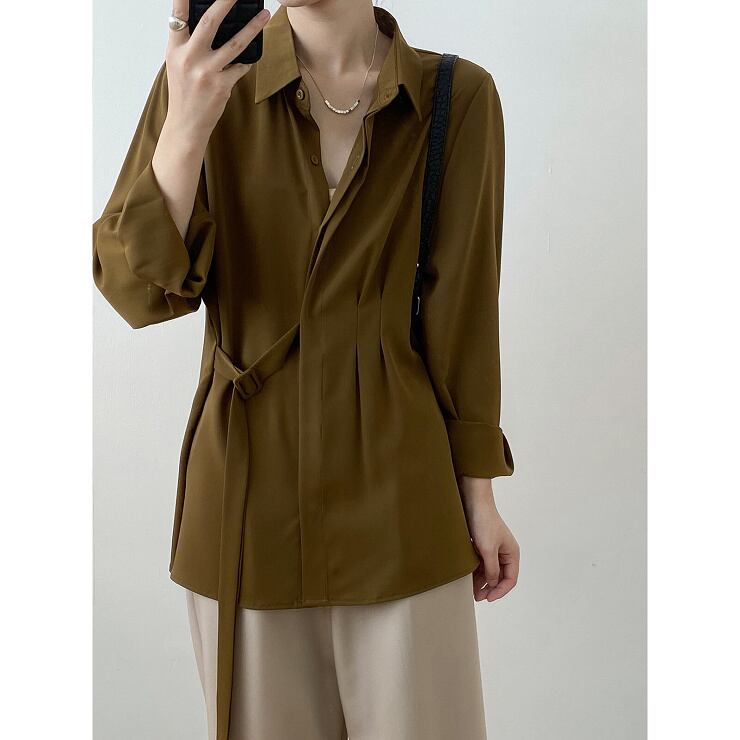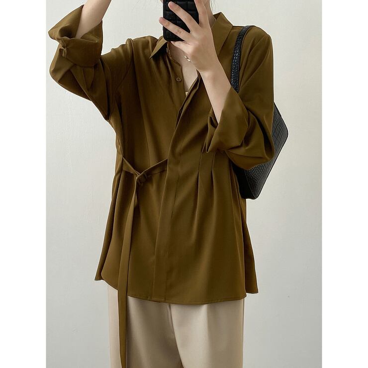 ブラウス シャツ 長袖 ロング丈 ベルト タック プリーツ ウエストシェイプ モノトーン 上品 シック エレガント きれいめ レディース トップス 黒 白 茶 B-0626 【お取寄せ】