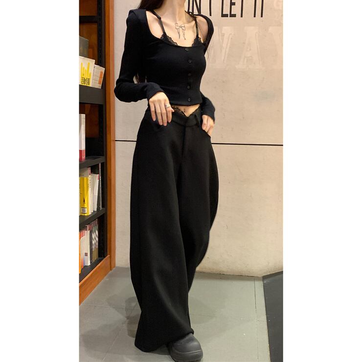 ワイドパンツ ハイウエスト レース スラックス ロングパンツ カジュアル きれいめ レディース ボトムス 黒 B-0658 【お取寄せ】
