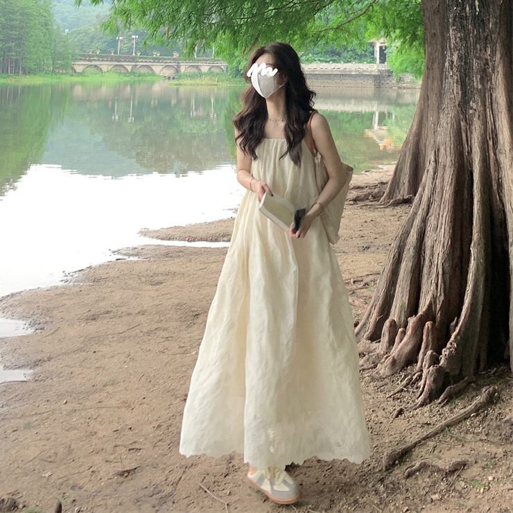 キャミワンピース ドレス ロング丈 刺繍 ノースリーブ ロングワンピース サスペンダードレス Aライン プルオーバー レディース アイボリー オフホワイト ベージュ B-0674 【お取寄せ】
