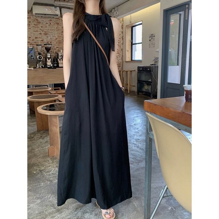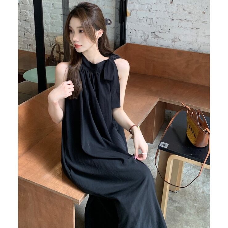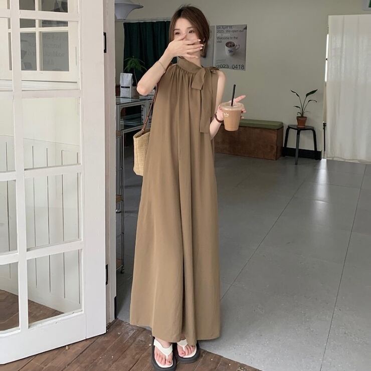 ノースリーブ ワンピース ロング丈 マキシ丈 アメリカンスリーブ リボン ギャザー Aライン ドレス レディース 黒 茶 B-0697 【お取寄せ】