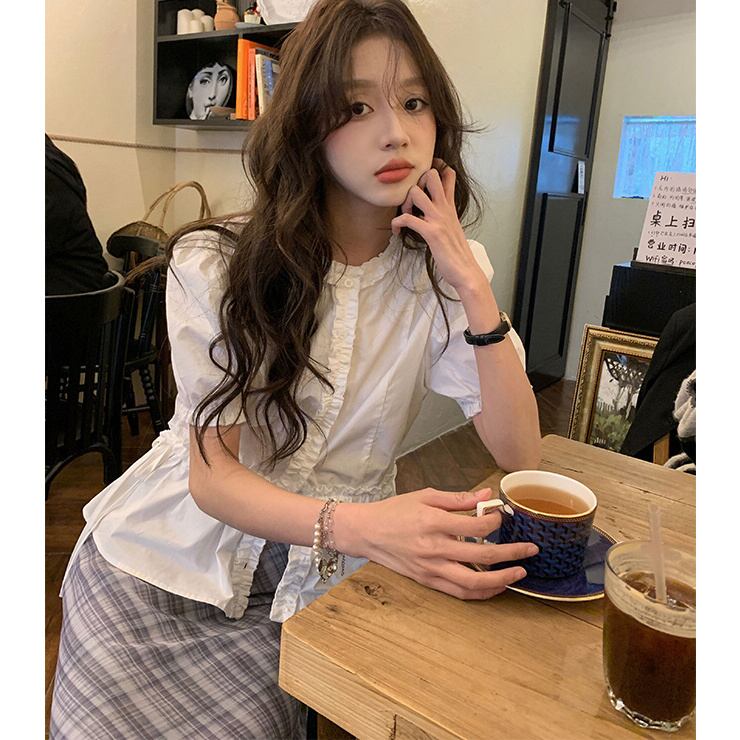 ブラウス 半袖 パフスリーブ フリル リボン ラウンドネック ガーリー Sinbounboun レディース トップス 白 B-0700 【お取寄せ】