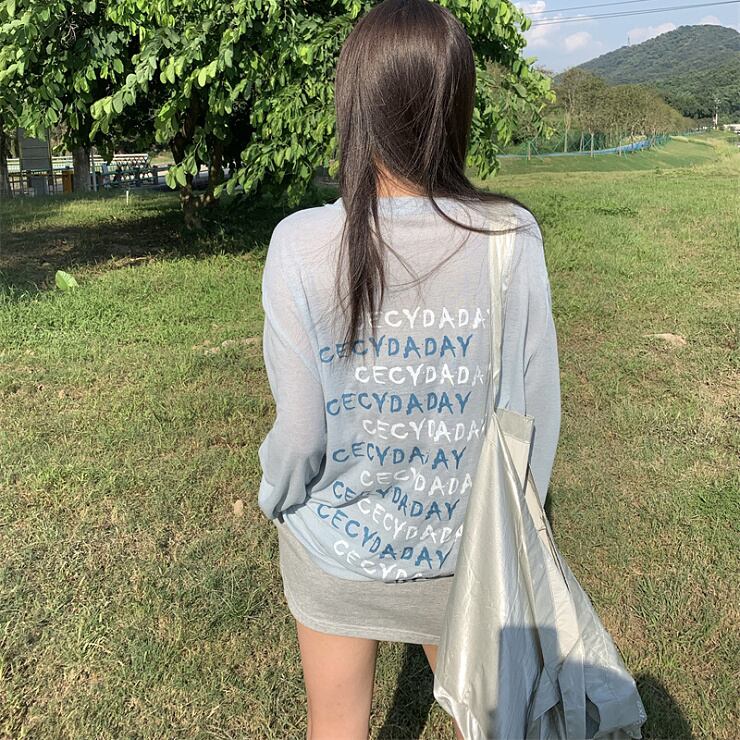 シアー Tシャツ 長袖 ロゴ バックプリント ラウンドネック シースルー 透け感 カットソー 日焼け対策 ゆったり ルーズ オーバーサイズ レディース トップス 白 青 緑 B-0703 【お取寄せ】
