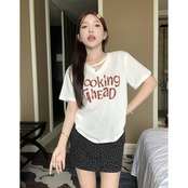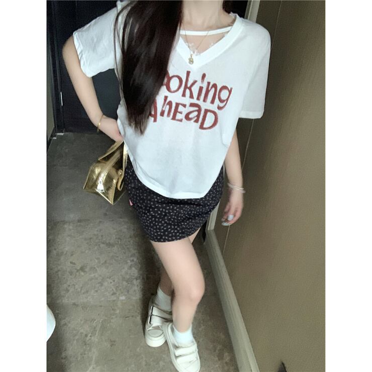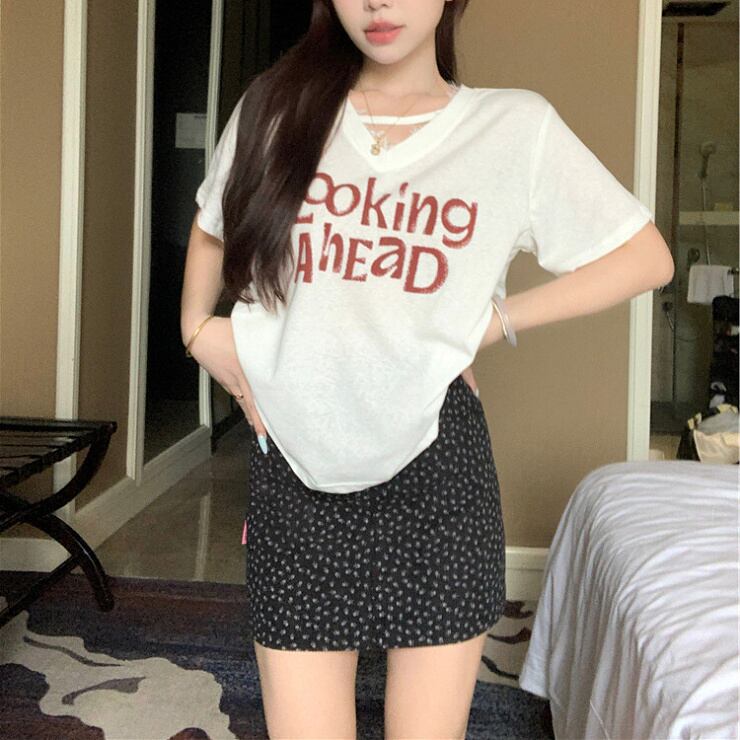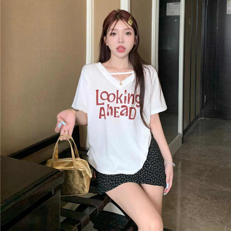 Tシャツ 半袖 ロゴ 英字 Vネック レース サイドギャザー カットアウト カットソー カジュアル レディース トップス 白 B-0723 【お取寄せ】