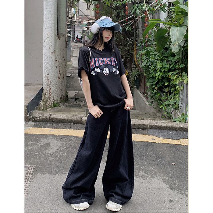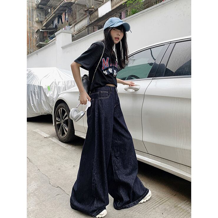 《2レングス》 デニムパンツ ワイドレッグ ハイウエスト ジーンズ ジーパン ゆったり レトロ カジュアル メンズライク ストリート レディース ボトムス インディゴ B-0735 【お取寄せ】