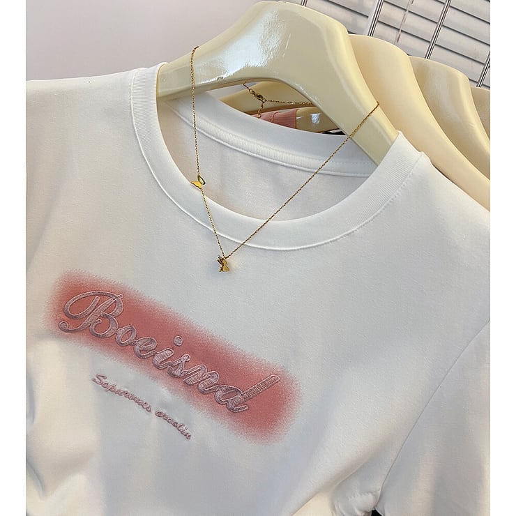 Tシャツ 半袖 ドローストリング ロゴ 刺繍 ラウンドネック サイドギャザー ショート丈 スリムフィット カジュアル 大きいサイズ レディース トップス 白 黒 B-0748 【お取寄せ】