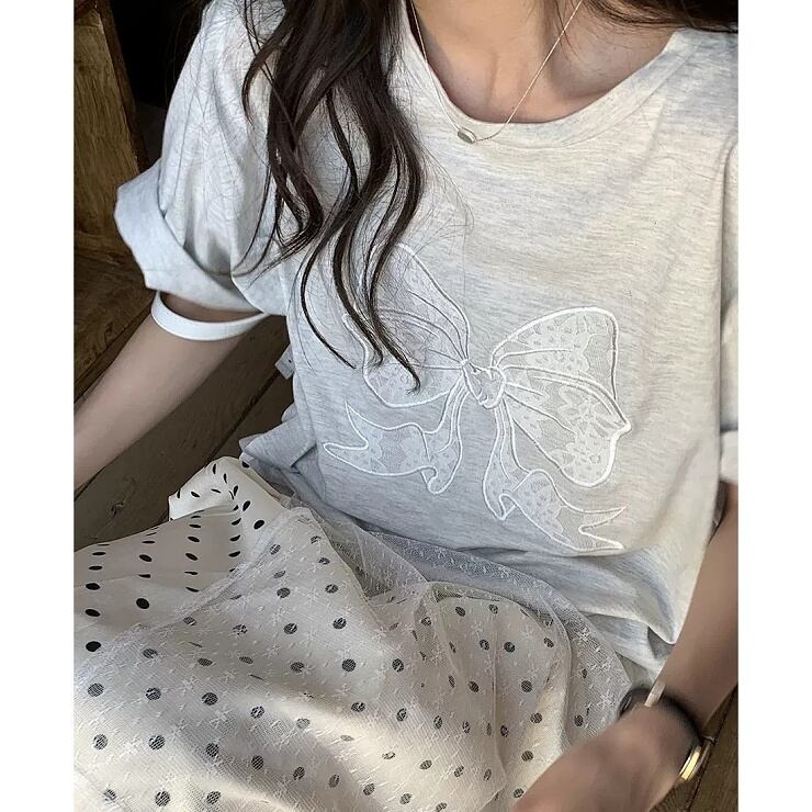 Tシャツ 半袖 リボン 刺繍 プリント レース ラウンドネック ルーズ ゆったり カジュアル Sinbounboun レディース トップス B-0762 【お取寄せ】