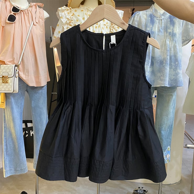ノースリーブ トップス ブラウス プリーツ ピンタック ラウンドネック Aライン タンクトップ プルオーバー レディース 黒 白 ベージュ アイボリー B-0765 【お取寄せ】