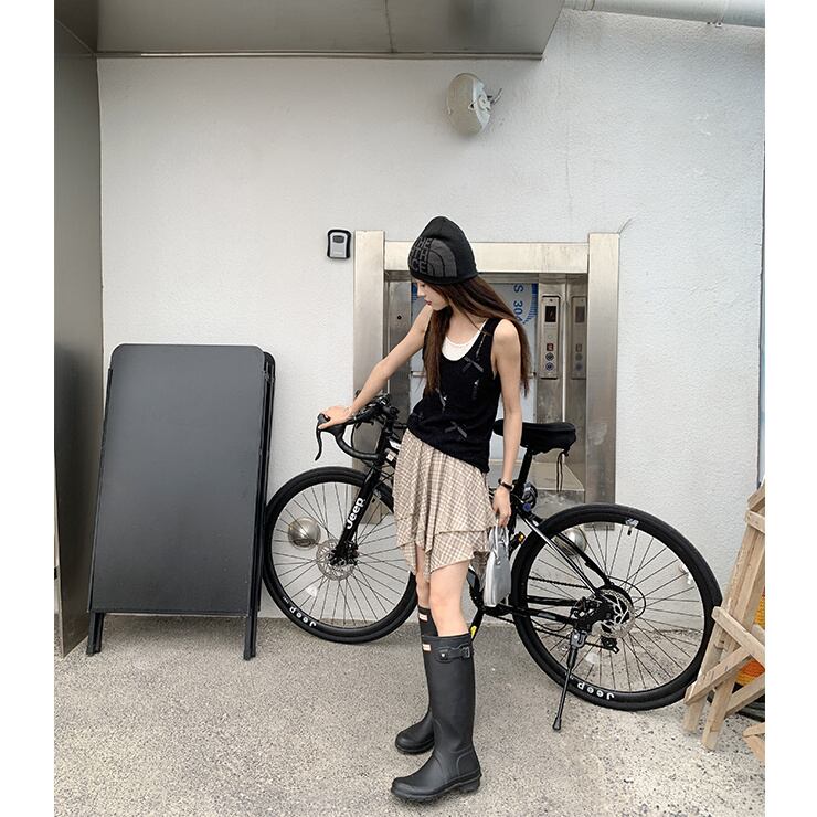 ニット ノースリーブ トップス フェイクレイヤード リボン ダメージ加工 ベスト タンクトップ カジュアル Sinbounboun レディース 黒 ベージュ アイボリー B-0772 【お取寄せ】