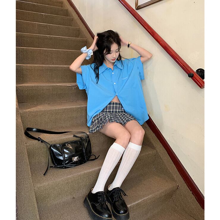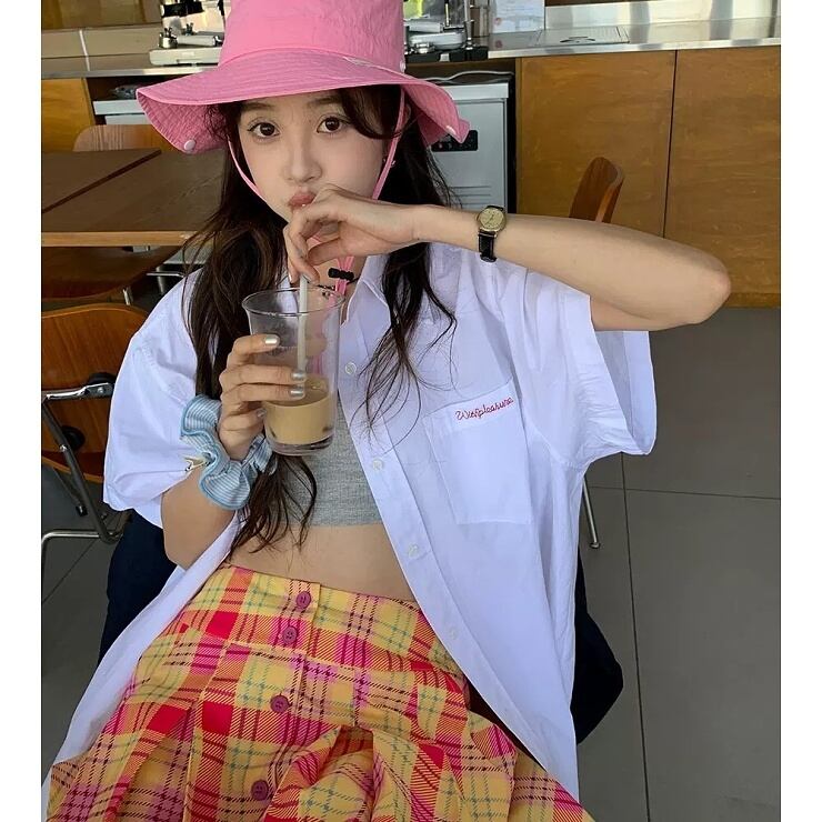 半袖 シャツ ロゴ 刺繡 ポケット シンプル ブラウス ゆったり オーバーサイズ ルーズ Sinbounboun レディース トップス 白 青 B-0776 【お取寄せ】
