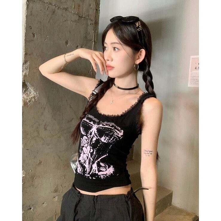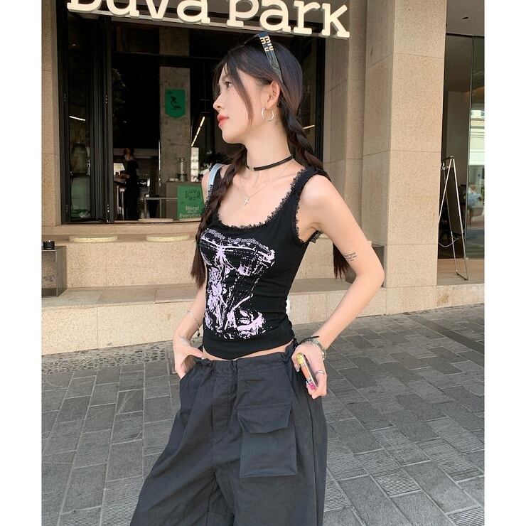 タンクトップ レース プリント ショート丈 ノースリーブ スリムフィット カジュアル レディース トップス 黒 B-0815 【お取寄せ】