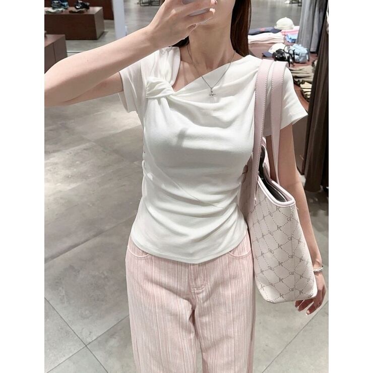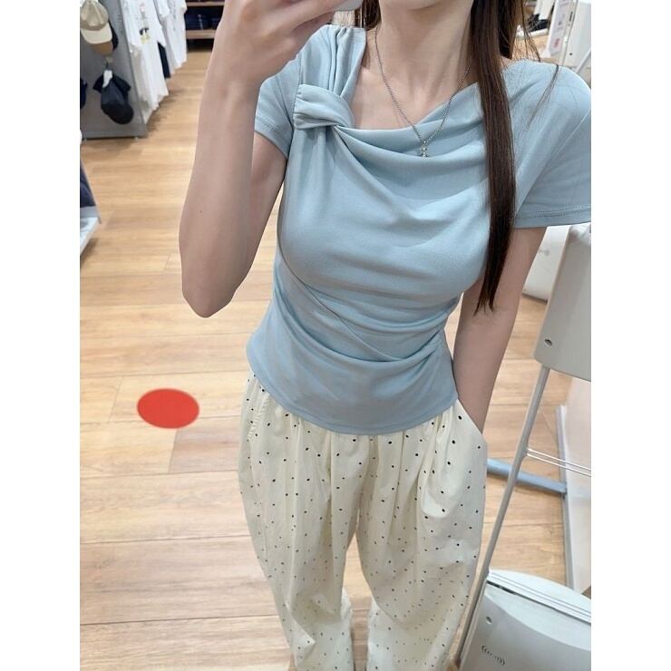 カットソー 半袖 ドレープ アシンメトリー サイドギャザー スリム Tシャツ レディース トップス 白 青 緑 B-0841 【お取寄せ】