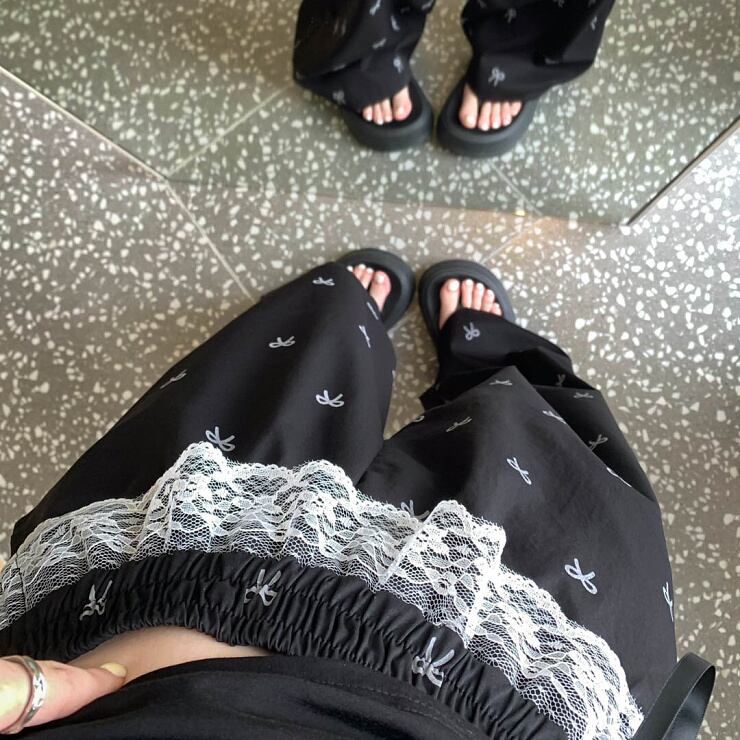 リボン柄 ワイドパンツ ウエストゴム レース リボン ハイウエスト ロングパンツ カジュアルパンツ レディース ボトムス 黒 白 オフホワイト アイボリー B-0884 【お取寄せ】
