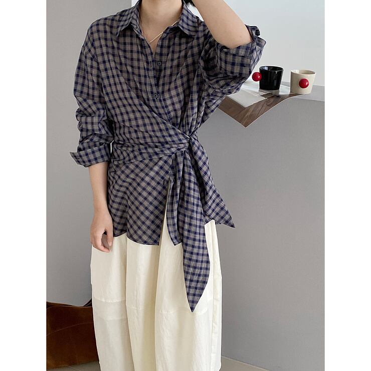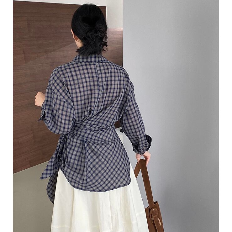 チェック柄 シャツ ブラウス 長袖 アシンメトリー 変形 トップス サイドスリット レディース トップス 水色 青 紺 B-0928 【お取寄せ】