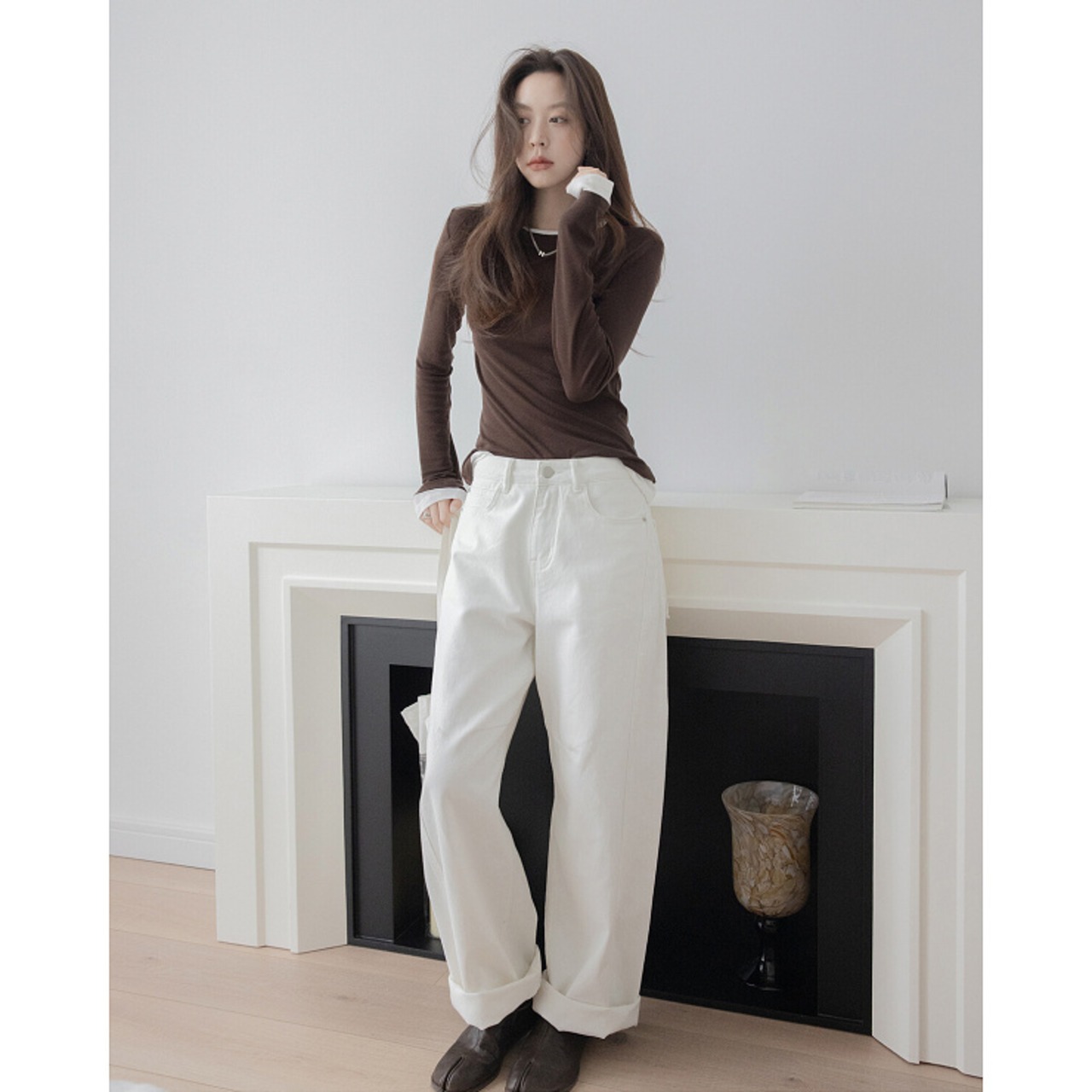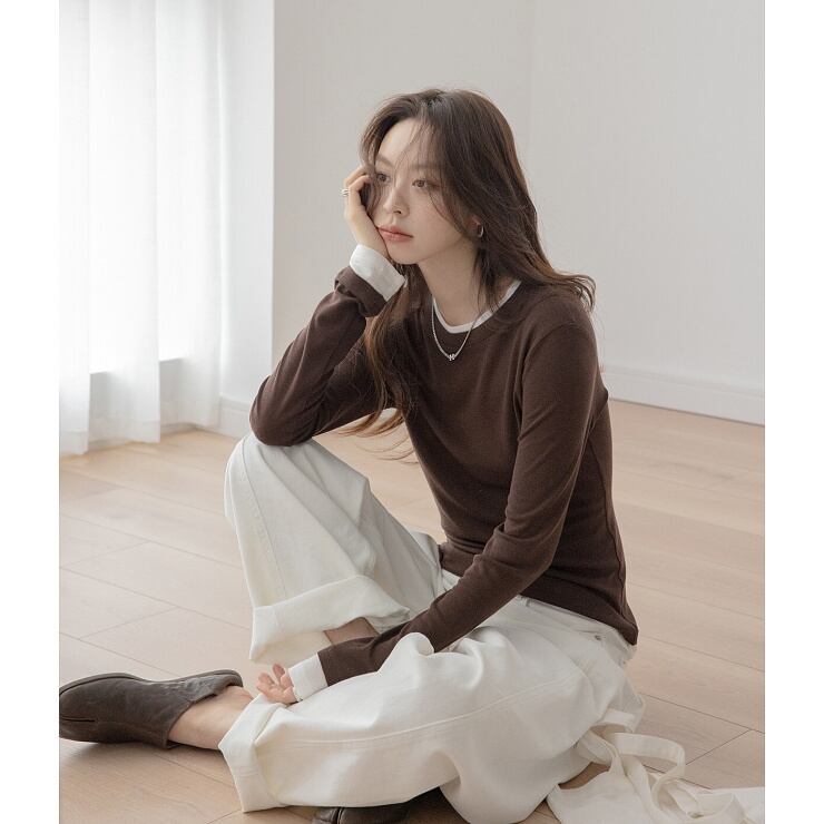 フェイクレイヤード カットソー Tシャツ 長袖 ラウンドネック 重ね着風 ロンT プルオーバー シンプル 大人 カジュアル vnook studio レディース トップス 黒 茶 B-0941 【お取寄せ】