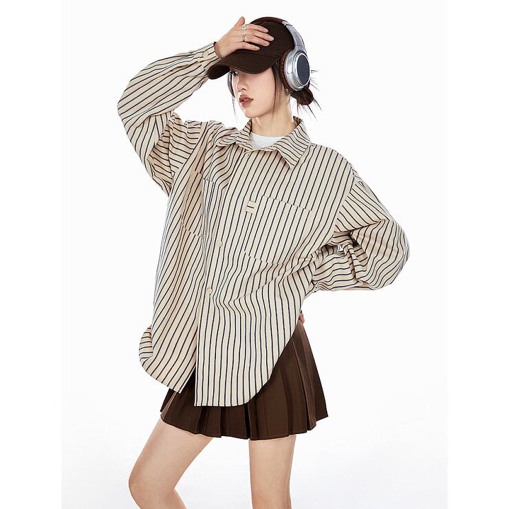 ストライプ シャツ 長袖 ドロップショルダー オーバーサイズ ルーズ ゆったり 大きいサイズ カジュアル メンズライク ストリート ICH MODE レディース トップス 青 ベージュ B-0942 【お取寄せ】