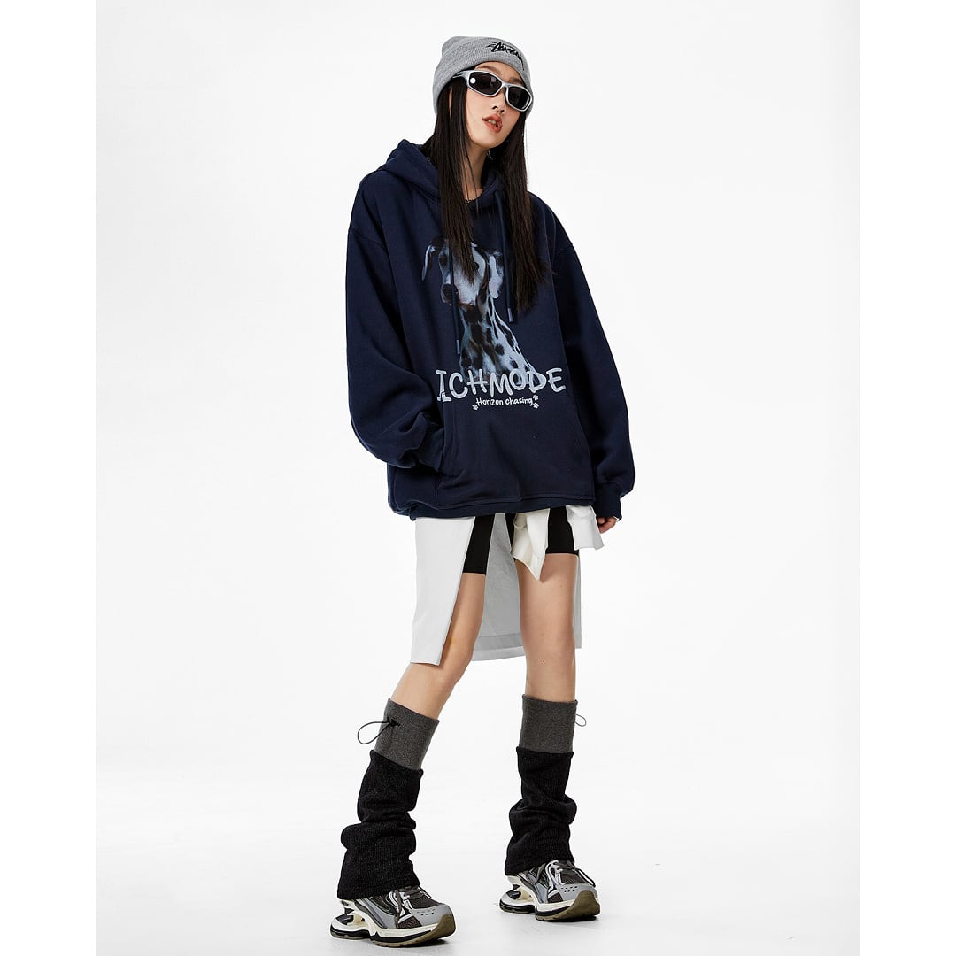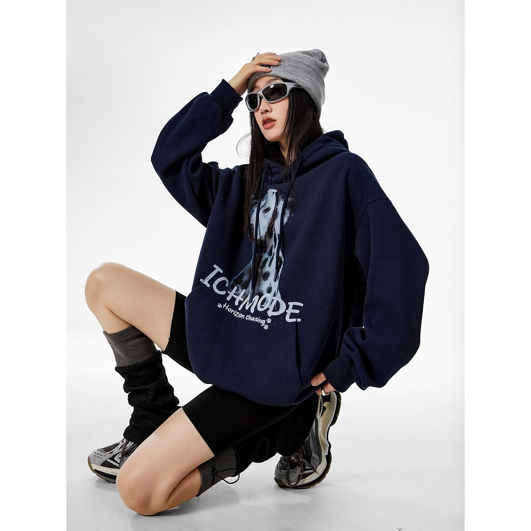 パーカー フーディー プルオーバー 裏起毛 犬 ロゴ プルパーカー 長袖 フード付き スウェットシャツ ルーズ オーバーサイズ カジュアル メンズライク ストリート ICH MODE レディース トップス 紺 ベージュ B-1024 【お取寄せ】