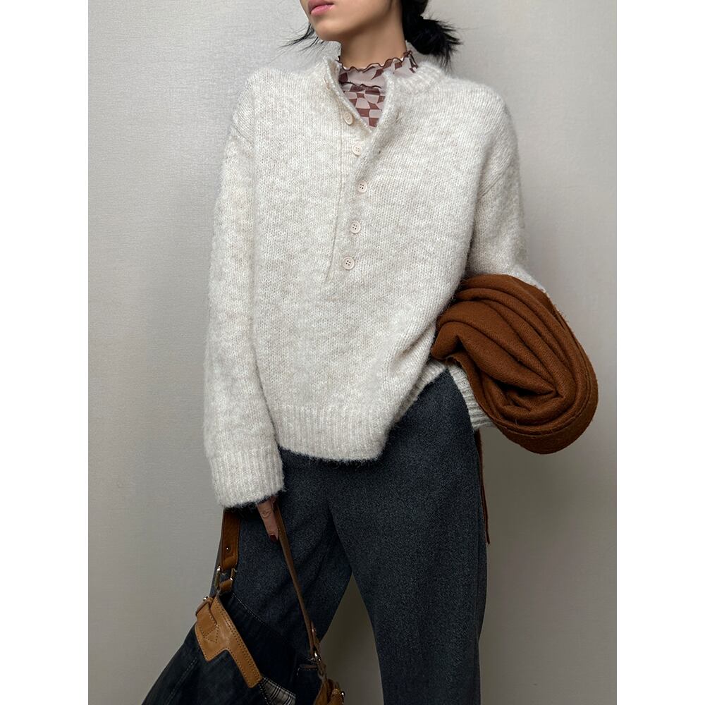 ニット プルオーバー セーター ヘンリーネック 長袖 ボタン カジュアル レディース トップス ピンク アイボリー オフホワイト ベージュ B-1078 【お取寄せ】