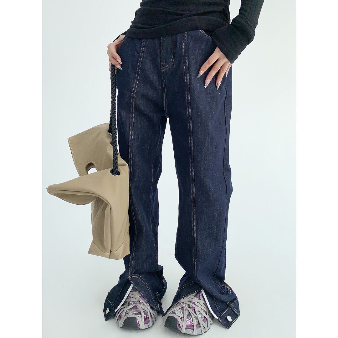 裾にポケットやジッパーが付いた、逆さにしたようなユニークデザインのデニムパンツ。